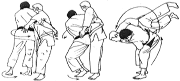 After grasping the belt, Tori lifts Uke hips and pulls Uke pulling hand forward, while moving his own pulling-arm side leg back and spinning around to bring Uke snugly against his back.